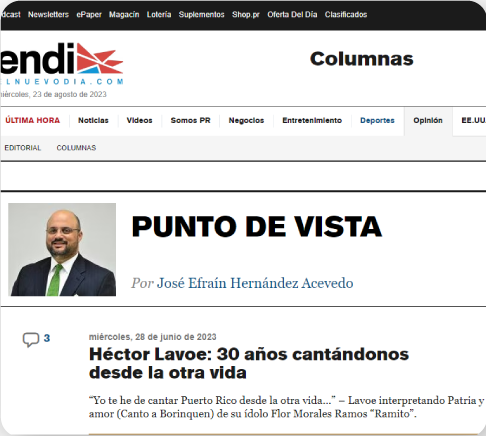 Doctor Hernández-Acevedo is a prominent analyst of local and international political issues. He has a political analysis radio program: Cátedra 580, together with Dr. Néstor Duprey-Salgado, which is broadcast Monday through Friday at 2:00 pm on WKAQ 580 AM. He also regularly works as a columnist for El Nuevo Día and as an analyst on political and legal issues on television. Doctor Hernández-Acevedo with his knowledge and professional experience, contributes to the improvement and development of Puerto Rican society.